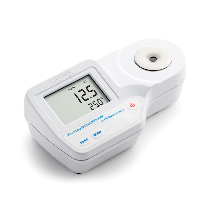 Este instrumento ótico utiliza a medição do índice de refração para determinar o conteúdo de soluções aquosas que contêm açúcar como % de frutose por peso (%p/p).