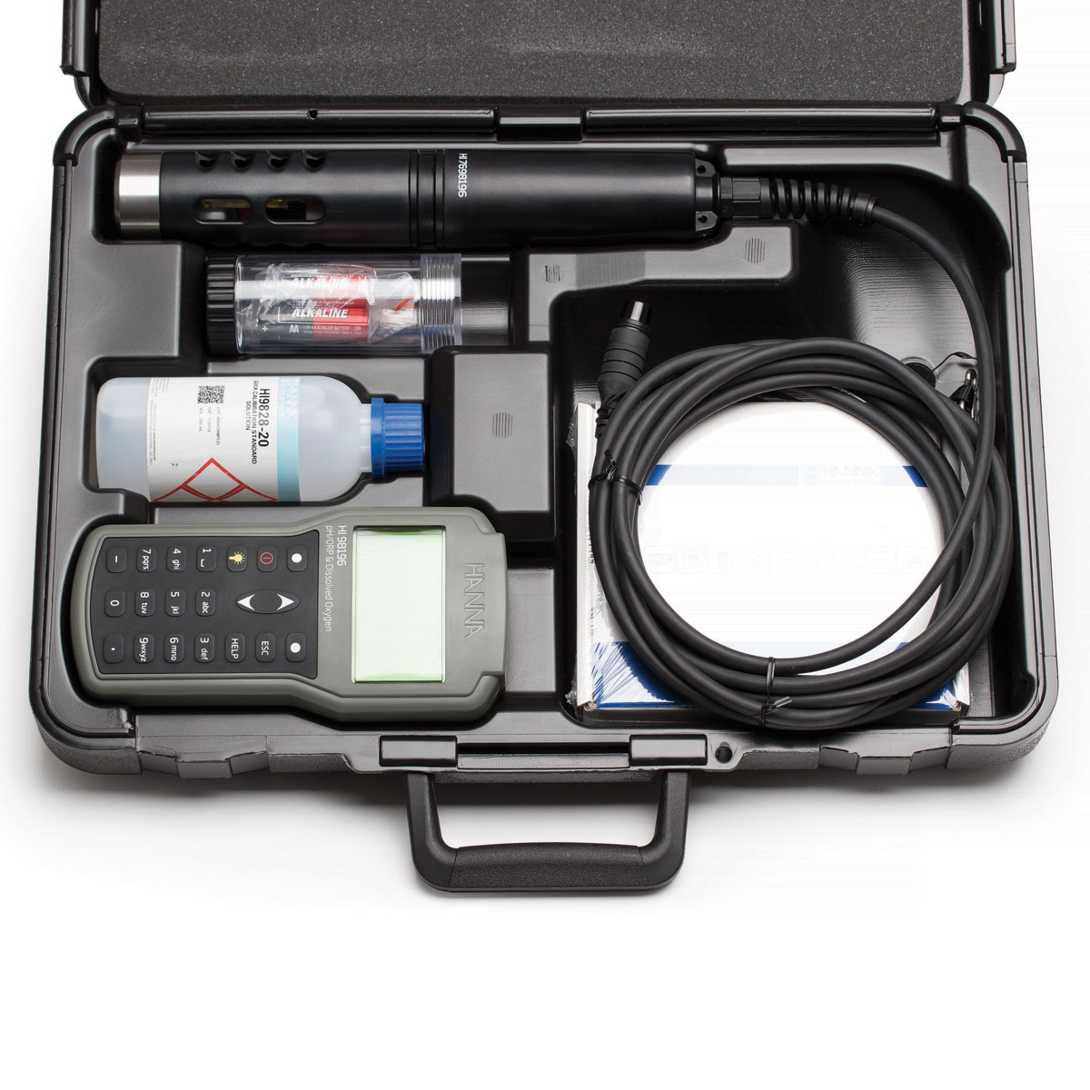 O HI98196 é fornecido com sonda HI7698196, sensor de pH/ORP HI7698194-1, sensor de OD HI7698194-2, estojo de manutenção da sonda HI76981942 (solução eletrolítica de OD HI7042S, membranas de OD (5), O-rings para sensores (5), seringa com gordura para lubrificar os O-rings), software Hanna para PC HI9298194, cabo micro USB HI920015, pilhas de 1.5V AA (4), manual de instruções, guia rápido de utilização, certificado de qualidade e uma mala rígida para transporte.