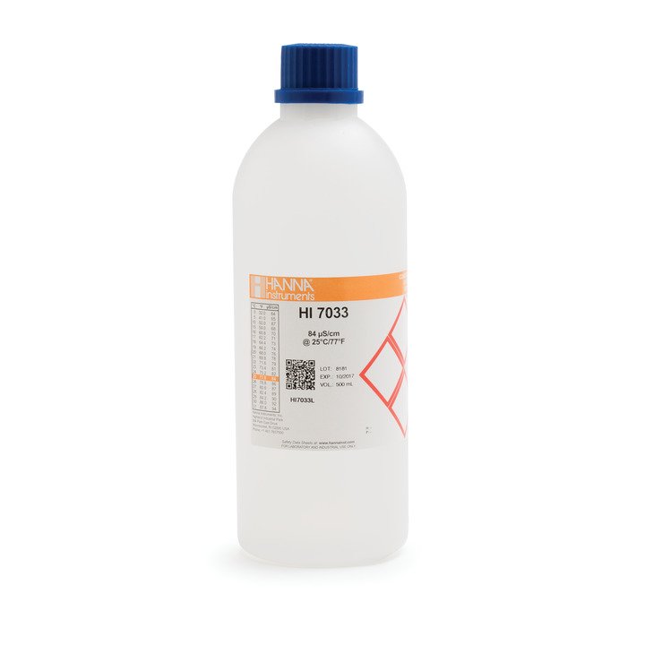 A solução de calibração a 84 μS/cm permite a calibração de instrumentos com gama de condutividade até 200 μS/cm, utilizada, por exemplo, na medição de amostras de água pura ou destilada.