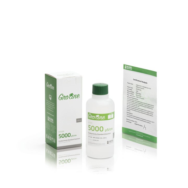HI7039-023 | Solução de calibração 5,000 uS GroLine, caixa, certificado de análise, 230 ml